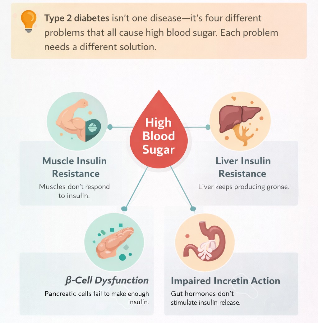 Type 2 diabetes isn’t one disease—it’s four different problems that all end up causing high blood sugar. Each problem needs a different solution. Think of it like a car that won’t start: the battery could be dead, the starter could be broken, you could be out of gas, or the fuel pump could be faulty. Same symptom, four different fixes.